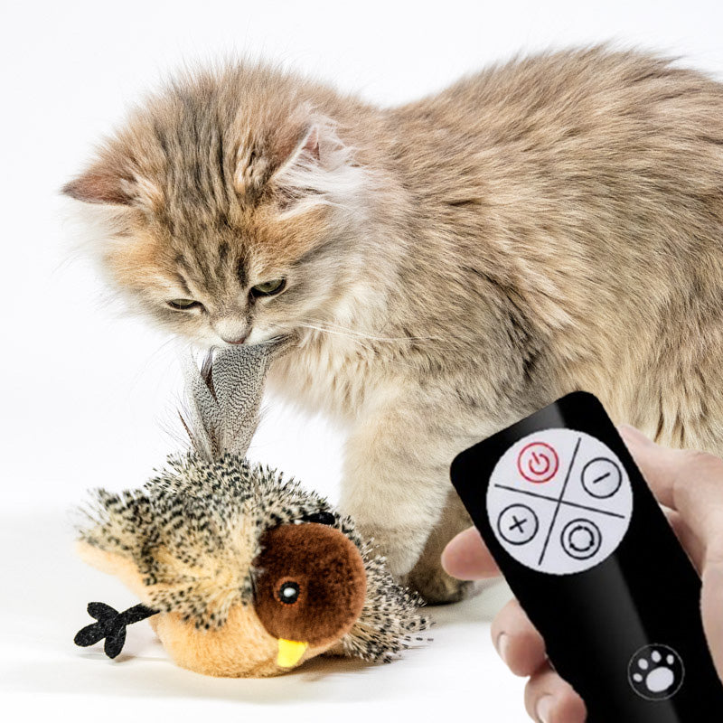 Sjungande sparv med flaxande vingar och rörelsesensor. Kattleksaken som verkligen stimulerar jaktinstinkten. Med naturtroget utseende och fågelljud samt att den kan flaxa med vingarna så har denna leksak blivit succe. Har inbyggd rörelsesensor och laddas enkelt med USB.